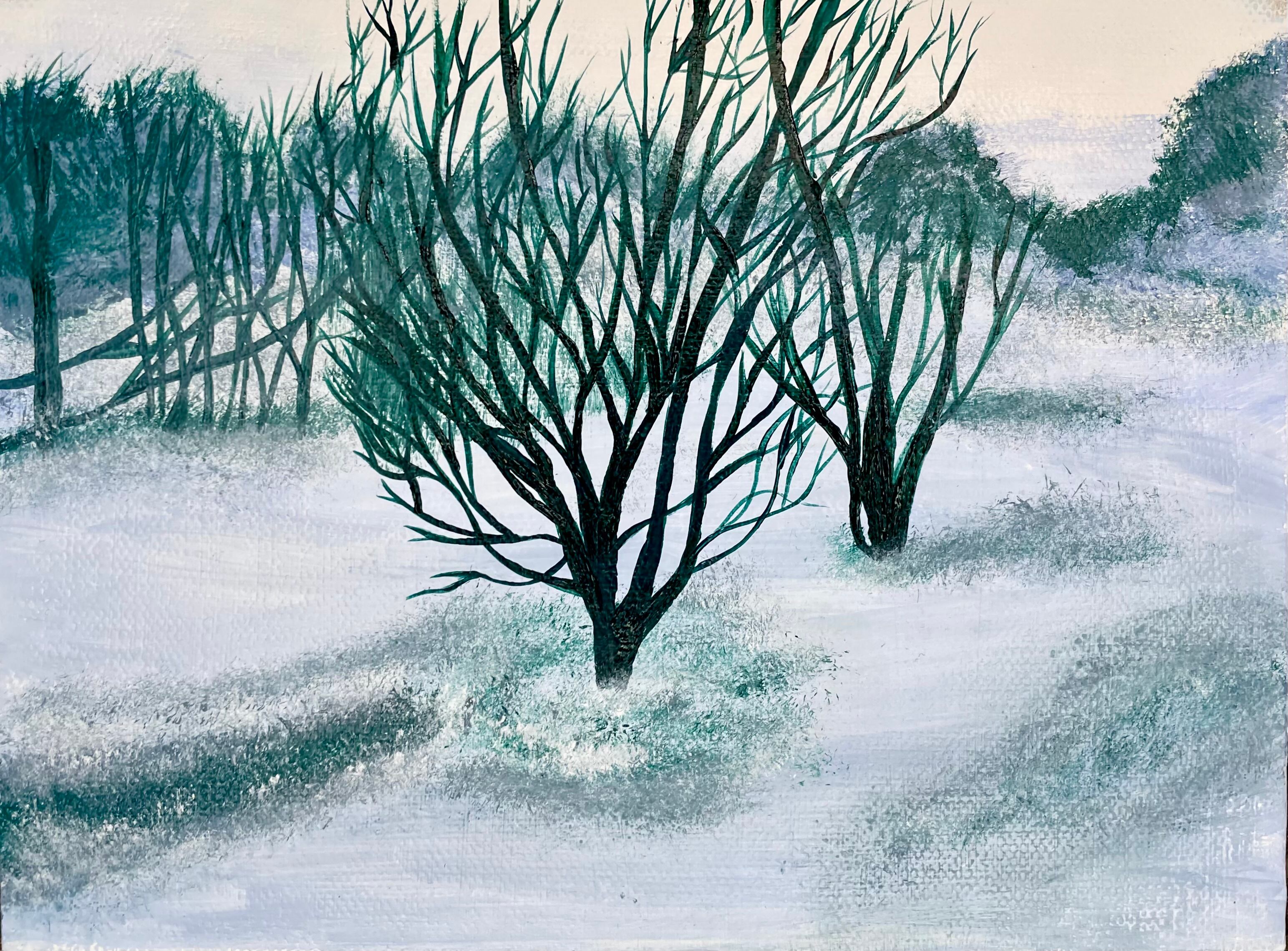 キャンバス地のパネルに描いた冬景色です。 アクリル絵具を使用しています。 冬景色 雪 木 キャンバス アクリル絵具 白 白銀の世界